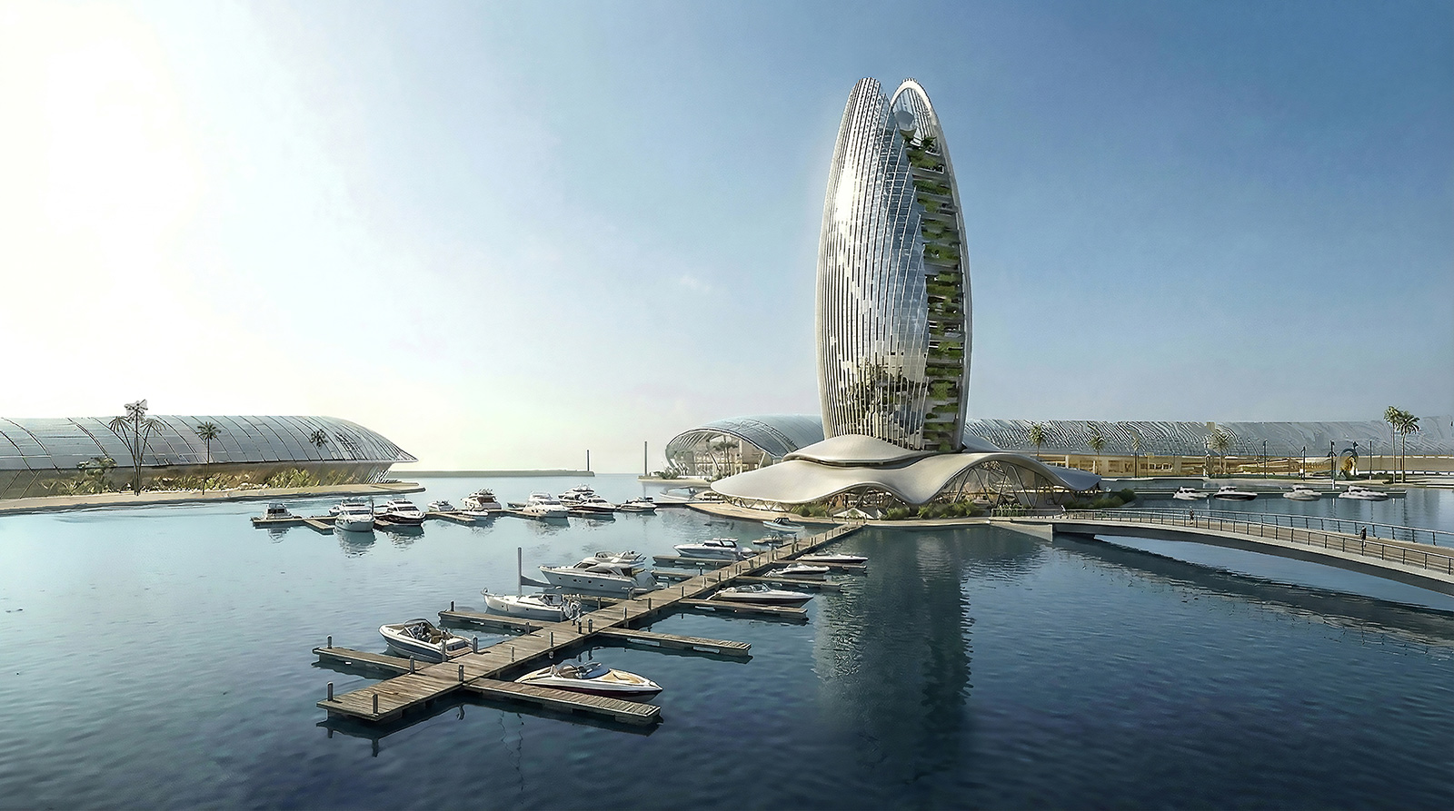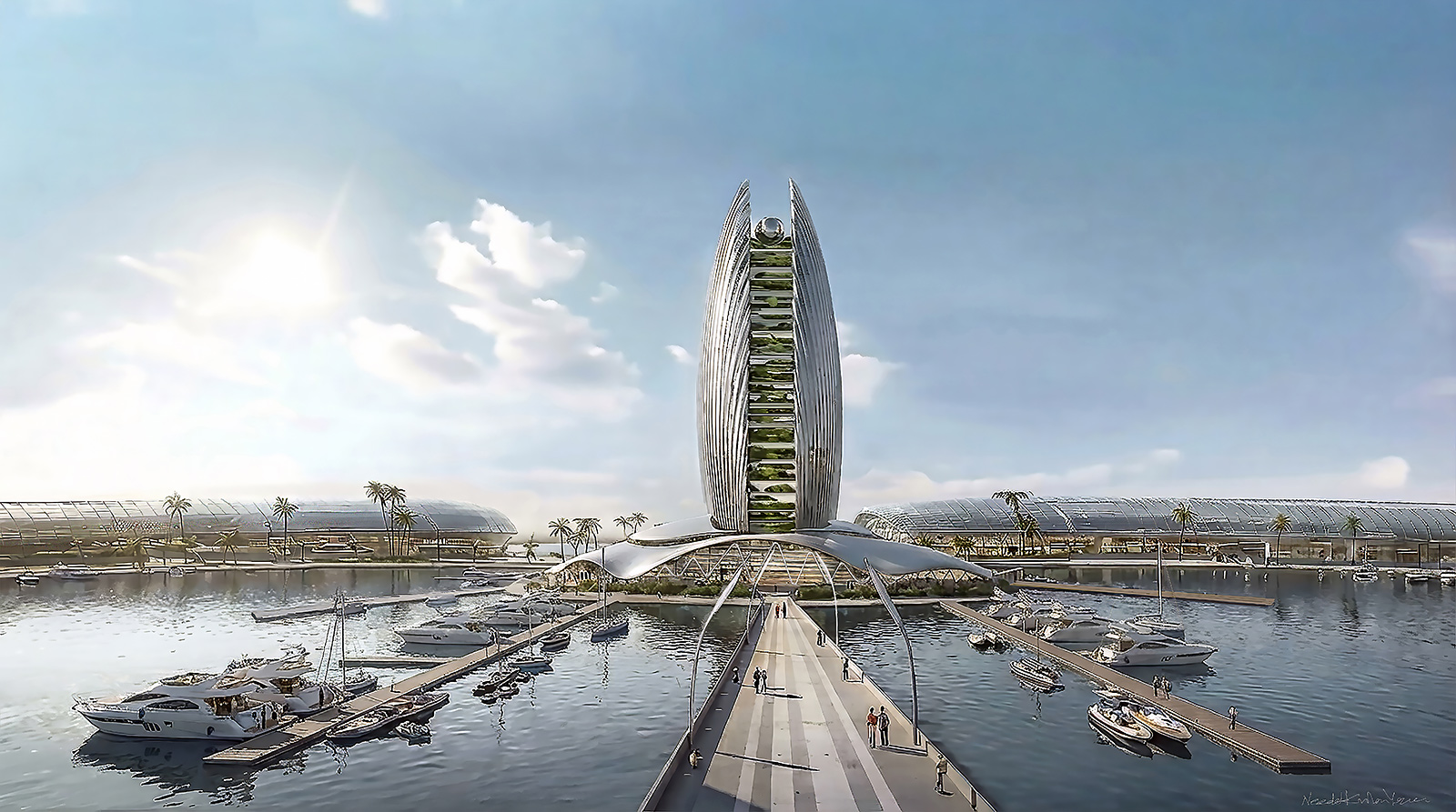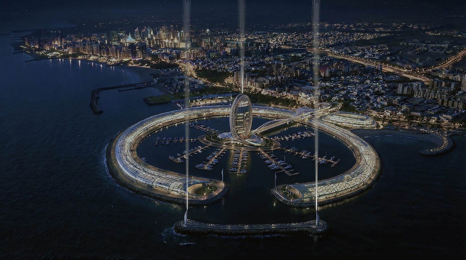 Al Fintas is designed to be the heart of Kuwait City, revitalizing the Kuwaiti coastline with its size, iconic design, and multifaceted program. This new marina and waterfront will offer unique public destinations accessible from both the sea and the city, catering to Kuwaiti people and yacht owners with diverse functions, unique shopping, and entertainment facilities under a continuous transparent roof. The project includes approximately 1,200 berths and a luxury hotel.