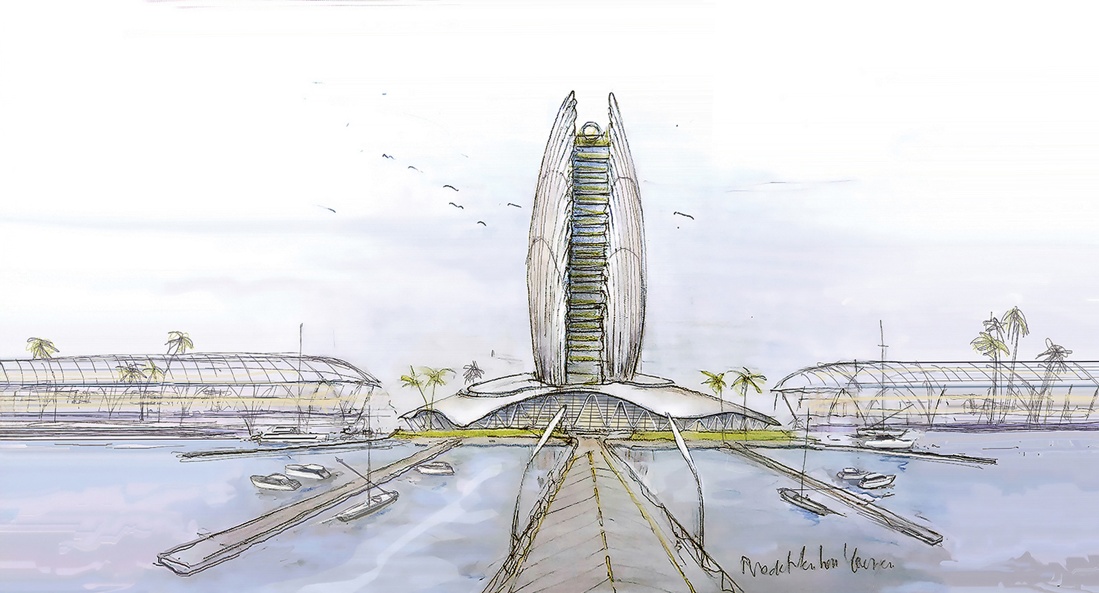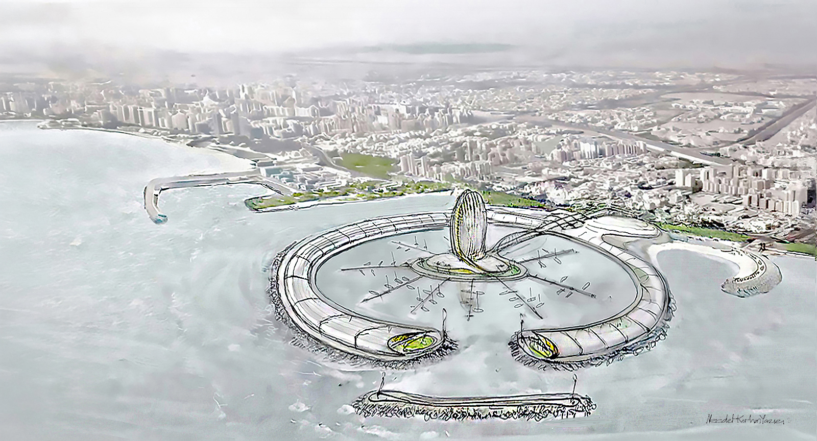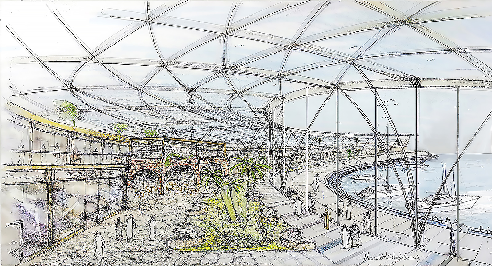 Al Fintas is designed to be the heart of Kuwait City, revitalizing the Kuwaiti coastline with its size, iconic design, and multifaceted program. This new marina and waterfront will offer unique public destinations accessible from both the sea and the city, catering to Kuwaiti people and yacht owners with diverse functions, unique shopping, and entertainment facilities under a continuous transparent roof. The project includes approximately 1,200 berths and a luxury hotel.